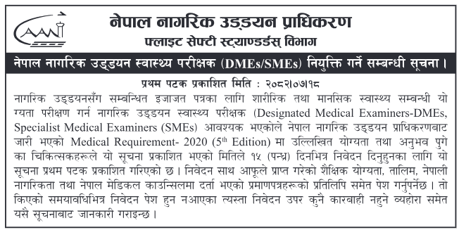 To certify the physical and mental fitness of pilots and cabin crew under Nepal Civil Aviation Regulations, the Civil Aviation Authority of Nepal (CAAN) requires Designated Medical Examiners (DMEs) and Specialist Medical Examiners (SMEs). Applications are invited from eligible and interested doctors as per the standards mentioned in Nepal Civil Aviation Medical Requirement – 2020 (5th Edition).